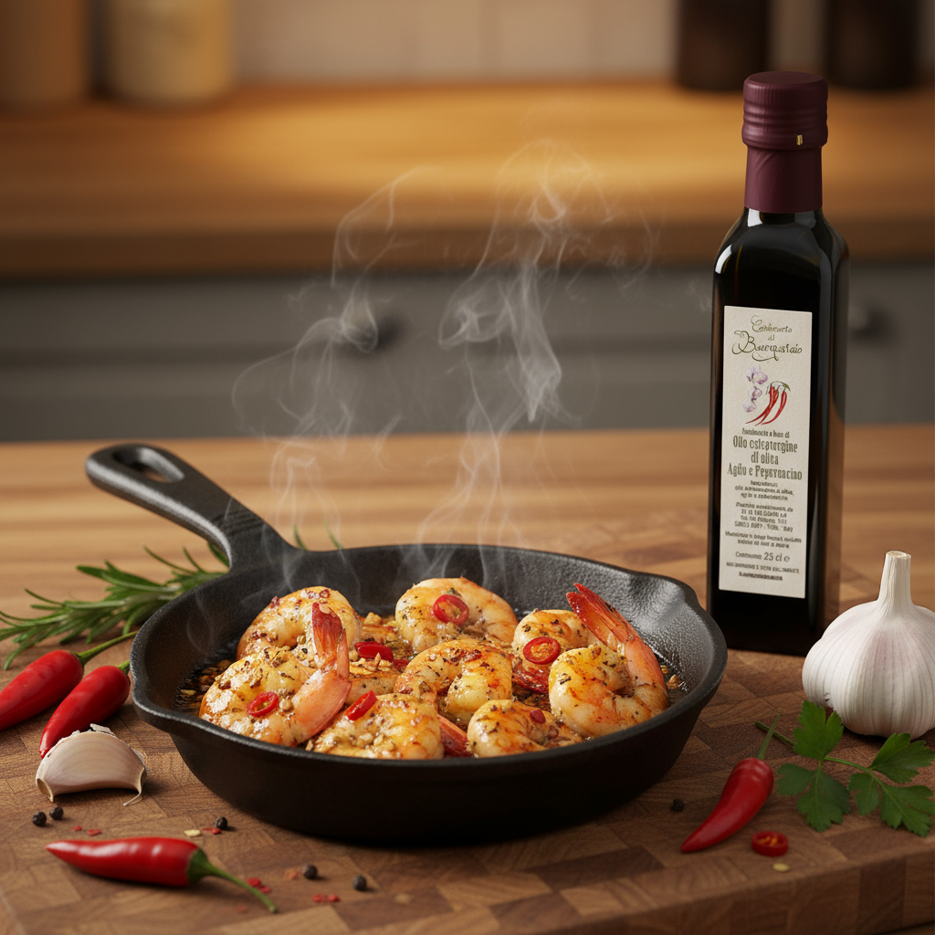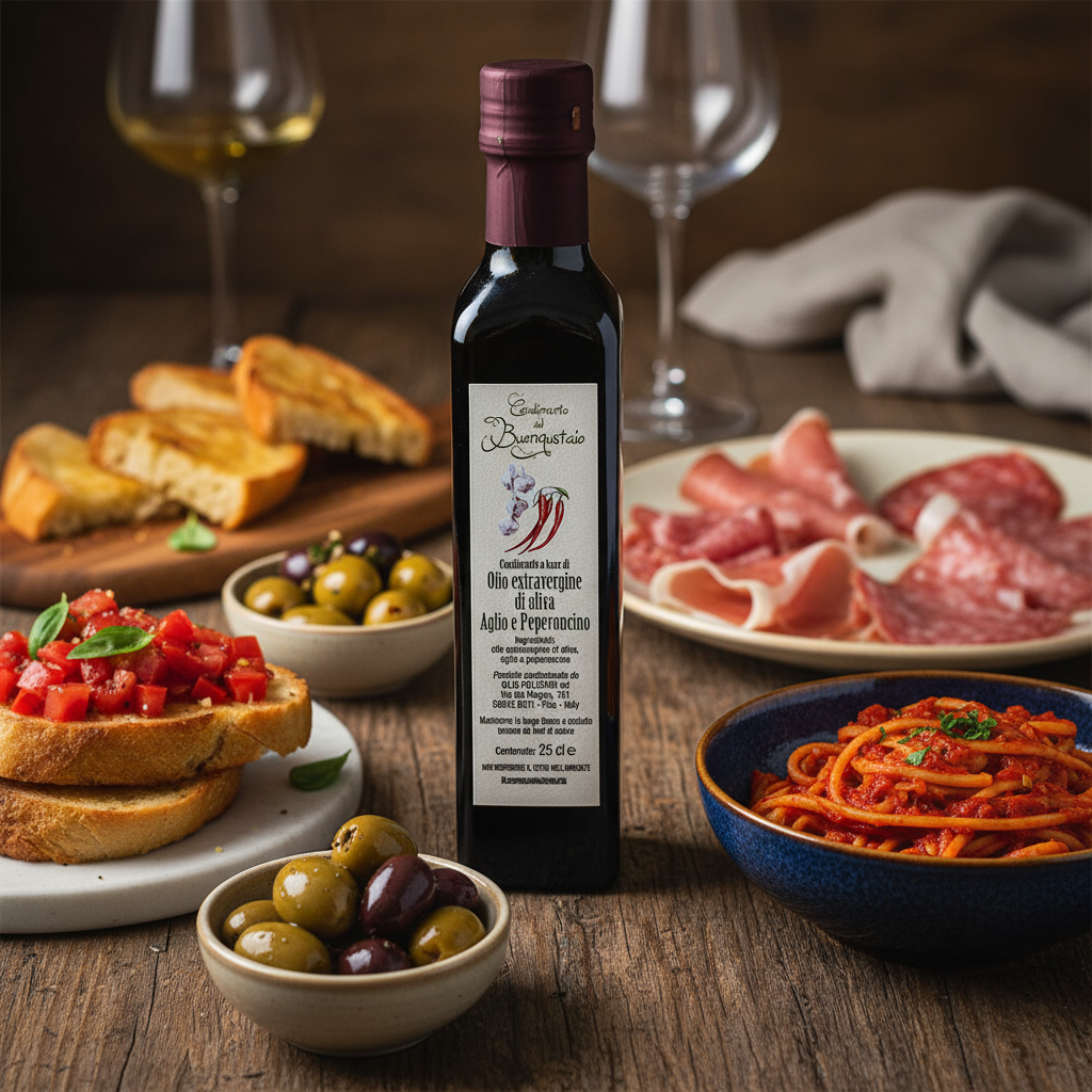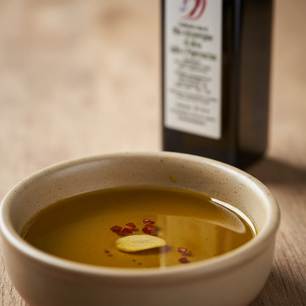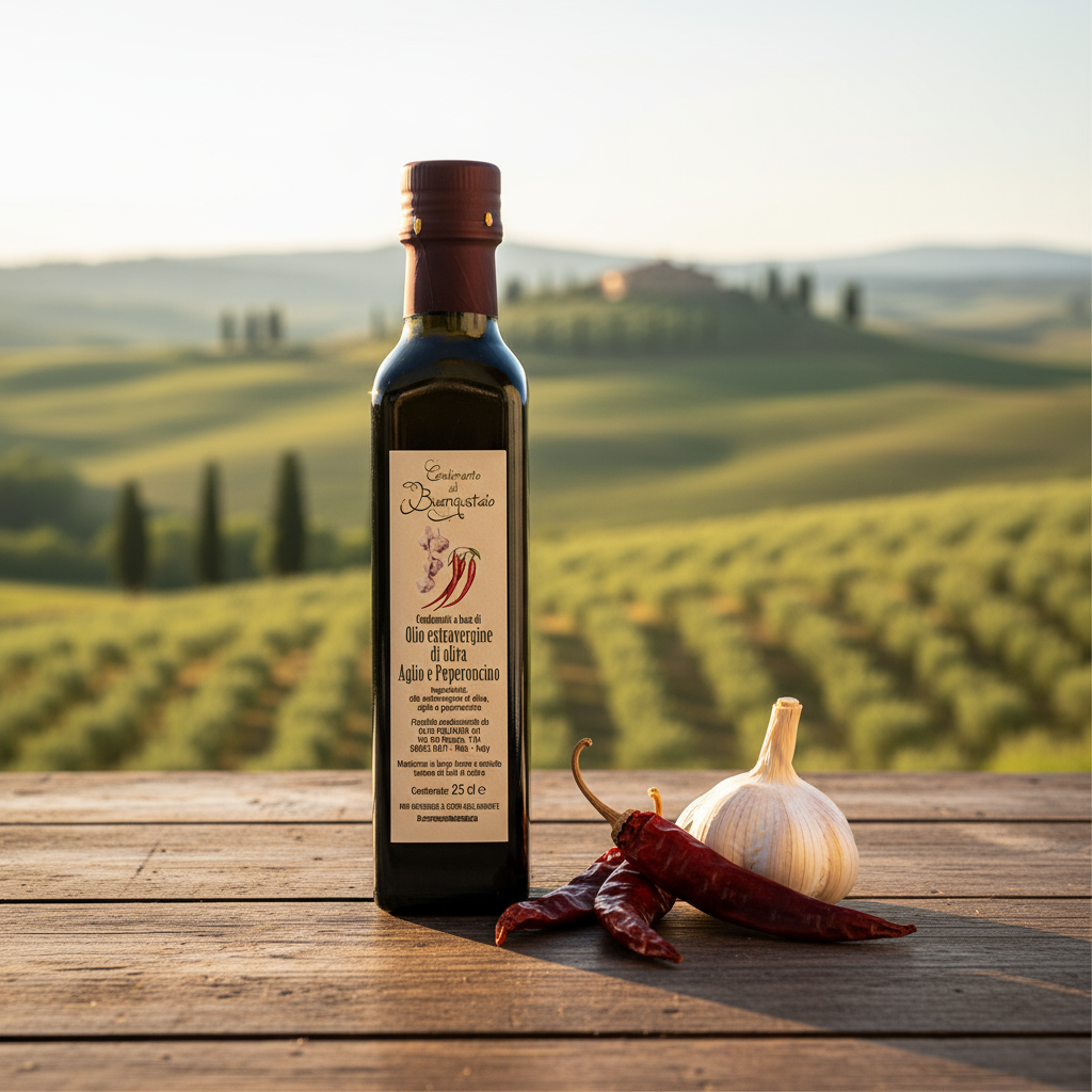 Entdecken Sie die perfekte Portion Feuer und Würze mit unserem Knoblauch-Peperoncino Olivenöl in der praktischen 250ml Flasche. Diese handliche Größe ist ideal für alle, die die intensive Kombination aus aromatischem Knoblauch und feurigen Peperoncini in kleineren Mengen genießen möchten. Hergestellt nach traditionellen toskanischen Methoden in unserem Familienbetrieb, vereint dieses erstklassige “extra vergine” Olivenöl die Milde handgeernteter Oliven mit der charakteristischen Schärfe getrockneter Chiliflocken und dem würzigen Aroma von frischem Knoblauch. Ohne künstliche Zusatzstoffe bietet es ein authentisches Geschmackserlebnis, das perfekt zum Experimentieren in der Küche geeignet ist. Ideal zum Verfeinern von Antipasti, als Basis für pikante Marinaden oder um Ihren Lieblingspasta-Gerichten den letzten Schliff zu geben.