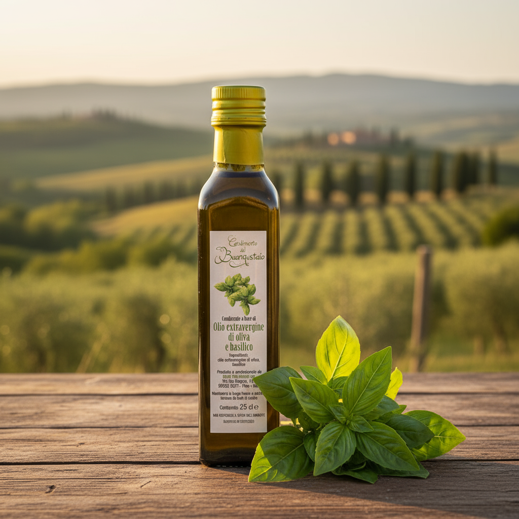 Fangen Sie den Duft eines italienischen Sommers ein mit unserem aromatischen Basilikum-Olivenöl in der praktischen 250ml Flasche. Dieses Öl ist eine Liebeserklärung an eines der beliebtesten Kräuter der mediterranen Küche. Auf der Basis unseres hochwertigen, kaltgepressten Olivenöls “extra vergine” entfaltet sich das frische, intensive Aroma von sonnengereiftem Basilikum. Hergestellt in unserem toskanischen Familienbetrieb, verwenden wir ausschließlich natürliche Zutaten, um Ihnen ein authentisches und unverfälschtes Geschmackserlebnis zu garantieren. Dieses Öl ist die perfekte Ergänzung zu Tomate-Mozzarella, verfeinert Pestos und Nudelgerichte und verleiht Salaten und Gemüse eine herrlich-frische Note. Holen Sie sich den Geschmack Italiens nach Hause und lassen Sie sich von der unwiderstehlichen Kombination aus Olivenöl und Basilikum inspirieren.