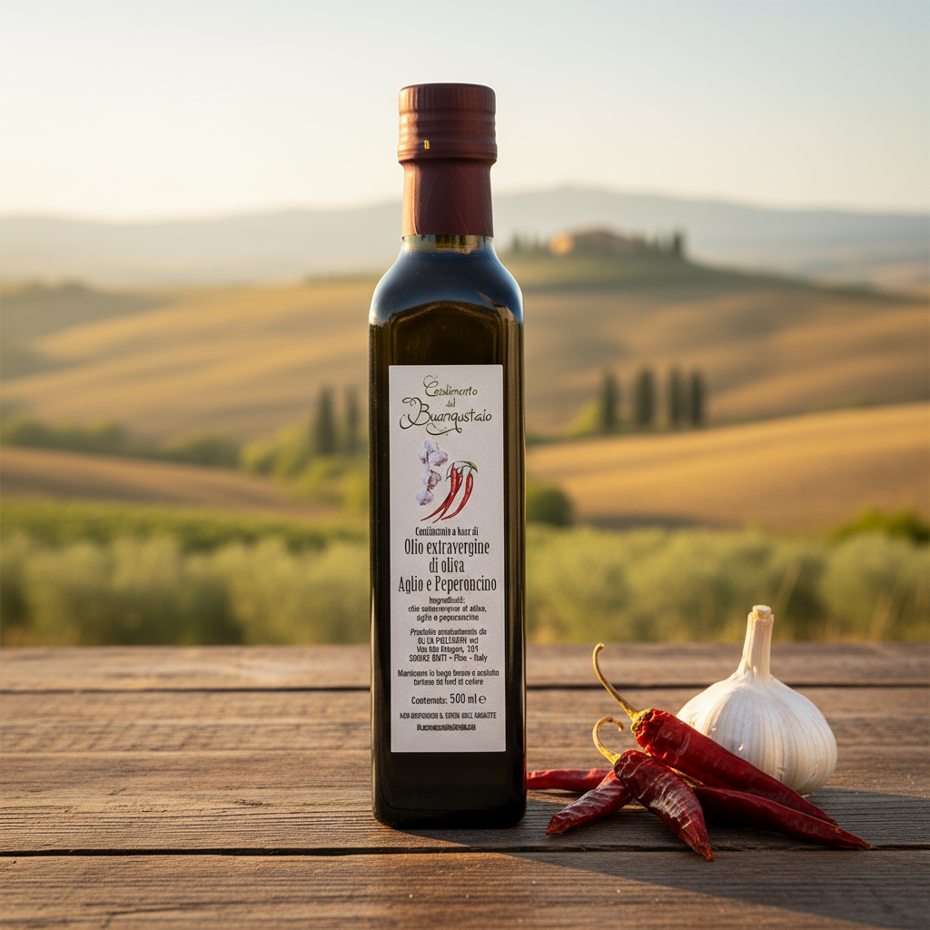 Erleben Sie eine Symphonie der Aromen mit unserem exquisiten Knoblauch-Peperoncino Olivenöl in der 500ml Flasche. Dieses Öl ist eine Hommage an die feurige Seele der toskanischen Küche und wird in einem traditionsreichen Familienbetrieb mit größter Sorgfalt hergestellt. Handgeerntete Oliven bilden die Basis für dieses erstklassige Olivenöl der Güteklasse “extra vergine”. Verfeinert wird es ausschließlich mit natürlichen, getrockneten Chiliflocken und aromatischem Knoblauch, was ihm eine angenehme Schärfe und eine unverwechselbare Würze verleiht, ohne den feinen Eigengeschmack des Olivenöls zu überdecken. Es werden keinerlei künstliche Zusatzstoffe verwendet, um Ihnen ein reines und authentisches Geschmackserlebnis zu garantieren. Perfekt zum Verfeinern von Pasta, zum Marinieren von Grillgut oder einfach als feuriger Dip zu frisch gebackenem Brot – dieses Öl ist eine Geschmacksexplosion, die Ihre Gerichte auf ein neues Level hebt.