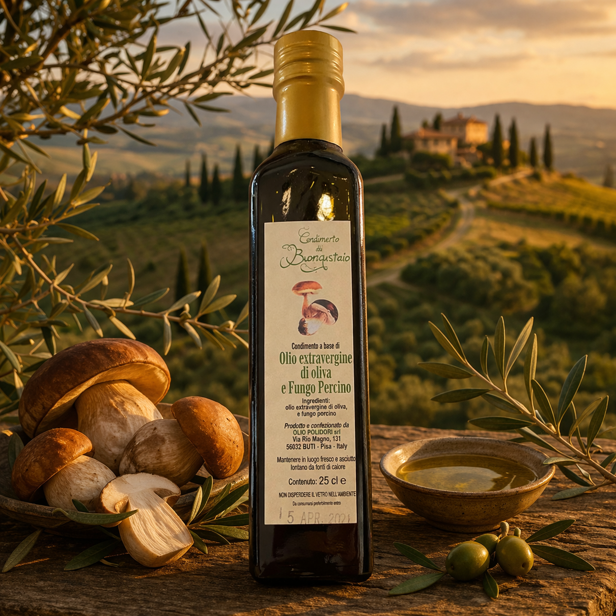 Olio extra vergine di Oliva aroma mit Steinpilzen- Erste Güteklasse, ausschließlich mit mechanischen Verfahren gewonnen.