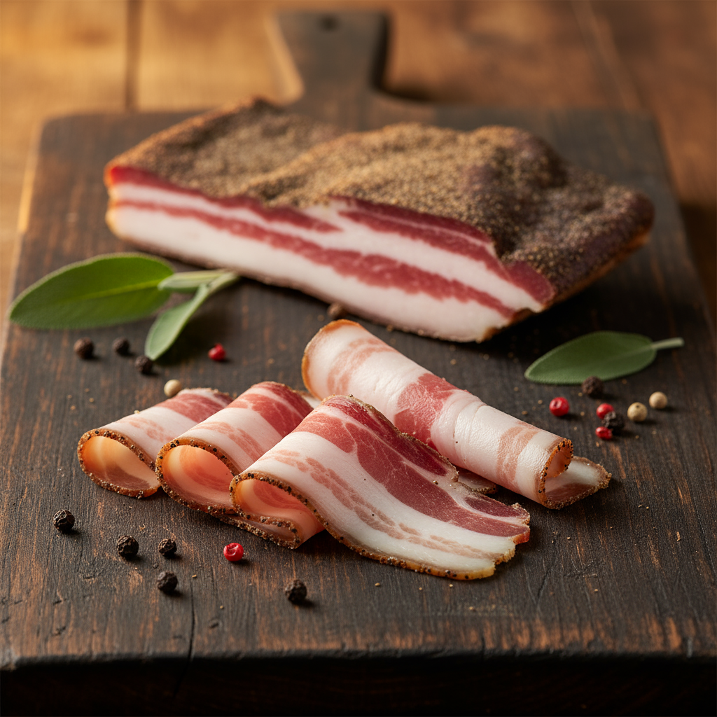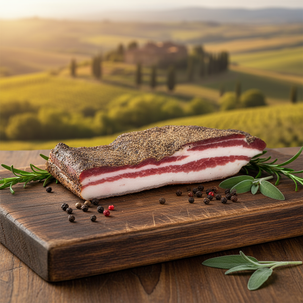 Entdecken Sie die Vielseitigkeit der italienischen Küche mit unserer Pancetta – einem traditionellen italienischen Bauchspeck, der zu den unverzichtbaren Grundzutaten der authentischen italienischen Kochkunst gehört. Diese handwerklich hergestellte Pancetta wird aus bestem Schweinebauch gefertigt und nach traditionellen Methoden mit einer aromatischen Mischung aus Salz, Pfeffer und mediterranen Gewürzen eingerieben. Die sorgfältige Lufttrocknung verleiht ihr ihren charakteristischen, intensiven Geschmack und die perfekte Balance zwischen magerem Fleisch und aromatischem Fett. Mit 250g erhalten Sie die ideale Menge für vielfältige kulinarische Anwendungen – von klassischen Pasta-Gerichten wie Carbonara und Amatriciana über herzhafte Risottos bis hin zu würzigen Suppen und Eintöpfen. Die Pancetta ist sowohl roh als dünne Scheiben genießbar als auch perfekt zum Anbraten geeignet, wo sie ihre Aromen voll entfaltet. Bringen Sie den authentischen Geschmack Italiens in Ihre Küche mit diesem vielseitigen Klassiker der italienischen Charcuterie.