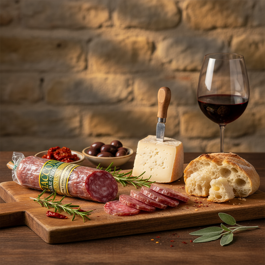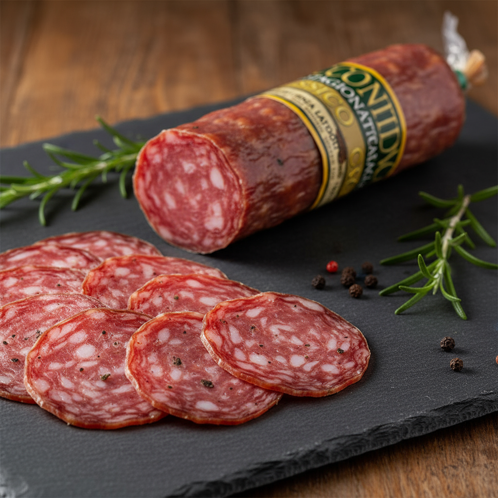 Entdecken Sie die authentische Seele der Toskana mit unserem Salame Classico – einer traditionellen toskanischen Salami, die nach jahrhundertealten Familienrezepturen hergestellt wird. Diese handwerklich gefertigte Salami verkörpert die reine Essenz der toskanischen Charcuterie-Kunst und wird aus bestem Schweinefleisch von lokalen Bauernhöfen gefertigt. Mit ihrer charakteristischen Würzmischung aus Knoblauch, schwarzem Pfeffer und mediterranen Kräutern entwickelt sie während der natürlichen Reifung ihr unverwechselbares, ausgewogenes Aroma. Die 140g Portion bietet Ihnen die perfekte Menge für authentische italienische Antipasti, als Belag für toskanisches Brot oder als Hauptzutat für herzhafte Pasta-Gerichte. Mit ihrer feinen Marmorierung und dem charakteristischen Geschmack ist sie der ideale Begleiter zu einem Glas Chianti und italienischem Käse. Erleben Sie den wahren Geschmack der Toskana – eine Salami, die Tradition und Qualität in jedem Bissen vereint.